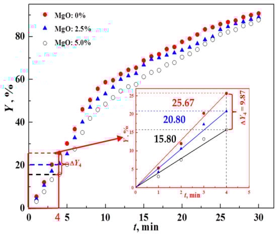 5.0% MgO bearing reagent ball: t = 60.21 − 22.17 × (1 − Y)1/3 − 126.08 × (1 − Y)2/3 + 85.23 × (1 − Y)
