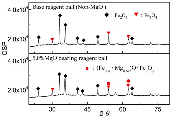 Furthermore, it can be calculated from Equations (5) and (6) that the oxidation of Fe3O4 for the base reagent ball will be completed at 49.93 min, while this value goes to 60.21 min for the 5.0% MgO bearing reagent ball. These results substantively verify the conclusion that MgO adversely affects the oxidation of Fe3O4. Moreover, The XRD analyses were performed to determine the main phase changes in the oxidation process. For convenient contrast, the reagent balls were fired at the same time (15 min). The XRD pattern is shown in Figure 8. It can be seen from Figure 8 that the Fe2O3 peak strength of base reagent ball is stronger than that of 5.0% MgO bearing reagent ball. Obviously, some of Fe3O4 is still un-oxidized in 5.0% MgO bearing reagent ball, the MF phase {(Fex·Mg1−x) O·Fe2O3, x = 0.36} is of existence.