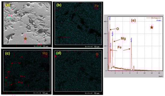 The presence of MF phase is also proven by the SEM analysis result with the 5.0% MgO bearing reagent ball in Figure 9. Figure 9b,c proves that the elemental Fe and elemental Mg coexists in a mutual solution way, then generates MF phase shown in Figure 9e.
