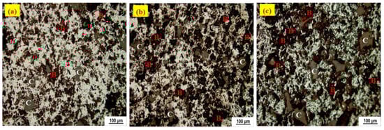 The fired pellet in pelletizing experiments was polished and observed by optical microscopy (Axio Imager M2M, ZEISS, Oberkochen, Germany). The metallographic of the pellet is shown in Figure 10. In the figure, “A” phase (pale-white) is hematite (Fe2O3); “B” phase (brown-gray) is magnetite and MF phase—{(Fex·Mg1−x) O·Fe2O3}; and “C” phase (charcoal-gray) is gangue minerals. It is seen that: (1) For Non-MgO flux pellet (Figure 10a), the recrystallization of Fe2O3 has done completely; (2) For MgO flux pellet (Figure 10b,c), the Fe2O3 crystals is relatively less and uneven.