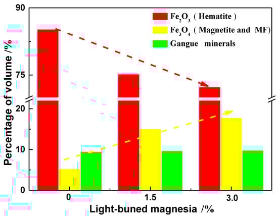 Based on the color aberration method, the detailed quantitative of the mineral composition in the pellet can be obtained. Here, it is remarkable that four samples for each kind of pellet are selected for analysis via the color aberration method, and the arithmetic mean value of the four results is used as the final result. The standard deviation of the hematite portion using color aberration method is 2.39%. The detailed mineral composition of different MgO dosage pellet is shown in Figure 12. Figure 12 illustrates that as the portion of light-burned magnesia increases from 0% to 3.0%, the hematite (Fe2O3) content decreases gradually from 85.22% to 72.34%, and the magnetite and MF phase content increases from 5.27% to 17.83%. These results indirectly prove that the MgO dosage restrains the oxidation of Fe3O4 into Fe2O3.