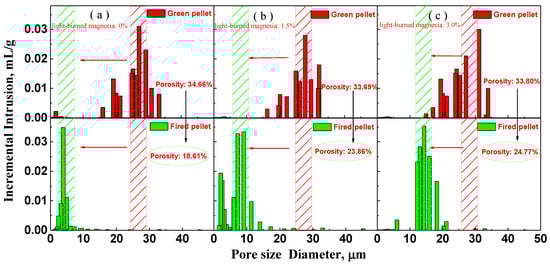Variation of porosity and pore distribution of the pellet during the induration process (a) 0% of light-burned magnesia; (b) 1.5% of light-burned magnesia; (c) 3.0% of light-burned magnesia.