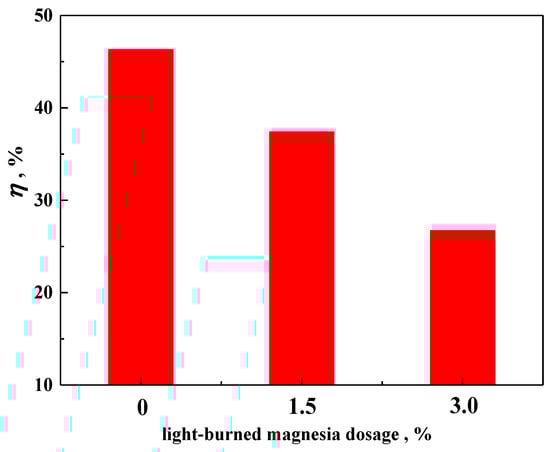 Oxide densification index (ODI) of the pellet calculated by Equation (2) is shown in Figure 14. It is indicated from Figure 14 that the ODI (η) decreases from 46.3% to 26.7% with the increasing of light-burned magnesia portion from 0% to 3.0%. There is no doubt that MgO plays a negative role in the densification process.