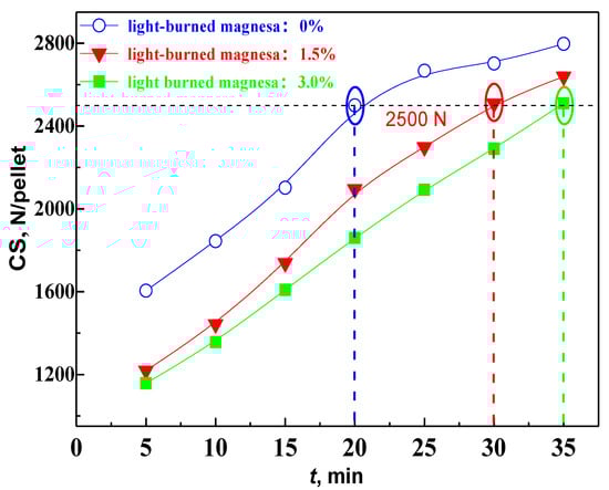 MgO adversely affects the oxidation process of Fe3O4. Also, MgO has a drawback to reduce the densification process of the pellet. The macroscopic phenomenon is that the strength of MgO flux pellet appears lower. The enhancing process of compressive strength (CS) was studied and the results are shown in Figure 15. The enhancing rate of CS for the MgO flux pellet (1.5% and 3.0% of light-burned magnesia) is slower than that for the Non-MgO flux pellet (0% of light-burned magnesia). It takes 20 min for Non-MgO flux pellet to obtain the desired CS (>2500 N/pellet []), while 35 min is needed for producing desired MgO flux pellet (3.0% of light-burned magnesia). Therefore, prolonging the induration time is an available method to obtain desired CS for producing the MgO flux pellet.