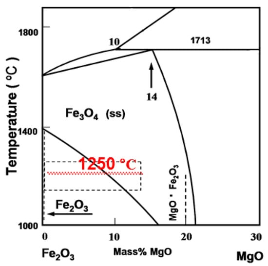 It is acknowledged that both the oxidation of magnetite (Fe3O4) into hematite (Fe2O3) and the sintering of hematite are important for pellet induration process. The lattice will also transit from cubic lattice to hexahedral lattice when the Fe3O4 is oxidized to Fe2O3. Because of sintering action and the lattice transition, the inner structure of pellet appears compact gradually and obtaining high strength. However, the MgO is found to impede the oxidation of Fe3O4 and then weak the densification behavior and lead to lower pellet strength. From Fe2O3-MgO phase diagram [] shown in Figure 16. It is proven that the presence of MgO will low the temperature of which the hematite dissociates back into the magnetite, which means that the presence of MgO will make the dissociated temperature lower from hematite to magnetite or magnesioferrite (MF phase), and therefore, result in restraining the oxidation of magnetite (Fe3O4) into hematite (Fe2O3).