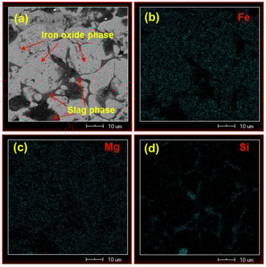 The Fe2+ and Mg2+ can achieve a solid solution in the fired temperature of pellet (dotted line rectangle in Figure 16), which is also proved by the SEM analysis of MgO flux pellet in Figure 17. Figure 17 shows that most of the elemental Mg and elemental Fe distribute almost uniformly in iron oxide phase. That means the elemental Fe and elemental Mg coexists in the pellet in a mutual solution way. There is a reaction between MgO and Fe3O4, which will produce MF phase—{(Fex·Mg1−x) O·Fe2O3}. It has been also found for MF—{(Fex·Mg1−x) O·Fe2O3, x = 0.36} in 5.0% MgO bearing reagent ball as shown in Figure 8, which is in accord with the phase diagram. The appearance of MF phase means that a part of Fe2+ is actually un-oxidized, which may result in the oxidation of Fe3O4 into Fe2O3 is impeded in a way. In addition, the MF phase has the same reverse spinel structure as the magnetite []. Consequently, the crystal transition from Fe3O4 to Fe2O3 existing in acid pellet is inhibited by MF phase. It may cause the uncompleted Fe2O3 recrystallization, limit the filling action of Fe2O3 crystal for the inner pore of pellet, and finally prevented the shrinkage and densification of the fired pellet. Therefore, MgO adversely affects the densification of pellets.