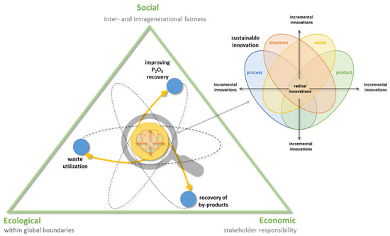 Multidimensional innovation is essential for improving P2O5 recovery, the utilization of waste, and the recovery of by-products within the boundaries of sustainable development [25,26]. Therefore, sustainable system innovation is a multidimensional concept that encompasses products, processes, and structures as well as various agents along the supply chain in addition to the society and becomes the vehicle and key mechanism in striving for a circular economy (see right part of Figure 2).