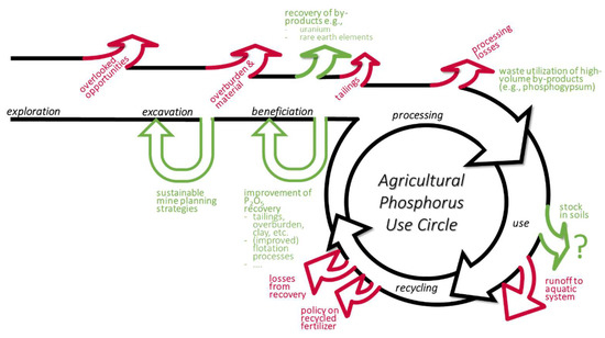 The definition of loss incorporates “the act of losing possession” [7]. We face losses at every stage along the phosphorus supply chain. However, not every loss qualifies for the term, according to the definition above. This raises the question of where we should start to minimize losses and, in turn, increase efficiency in order to support sustainable mineral-resource management and foster a circular economy.