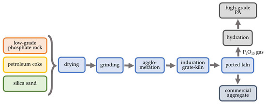 Lower-grade phosphate-rock concentrate (>15% P2O5), petroleum coke, and silica sand are fed to a dryer in order to remove moisture. The output from the dryer is screened and ground and then the balling equipment is used to produce 3/8-inch-diameter (approximately 9.5 mm) balls. The induration rotary kiln is used to preheat the material with the beneficial side effect of eliminating most of the heavy-metal impurities. Within the main kiln (rotary kiln, ported kiln), phosphorus is reduced from the balls and together with oxygen compounded to P4O10 gas. Using a standard acid hydrator, the phosphoric gas is cooled and absorbed in water, which produces a 70% P2O5 PA. The remaining material (mostly hard calcium silicate) from the main kiln is cooled and sold for use as construction aggregate [84]. Subsequently, Figure 5 shows a simplified flowchart of the process.