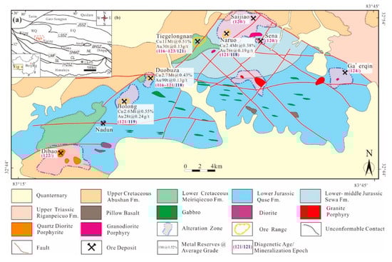 There are several porphyry deposits, epithermal deposits, and porphyry and epithermal ore prospects in the Duolong district (Figure 1). The Duobuza [], the Bolong [], and the Naruo [] are porphyry Cu (Au) deposits. Whereas, the Tiegelongnan deposit is a porphyry deposit overprinted by epithermal deposit [,]. In the Dibao, Nadun, Sena, Saijiao, and the Ga’erqin areas, there are porphyry or epithermal ore prospects (Figure 1b). Li et al., (2011) and Lin et al., (2017) suggested these deposits are related to granodiorite and quartz diorite porphyry intrusions being emplaced during 123–116 Ma, and their mineralization timing is between 120 Ma and 118 Ma [,].
