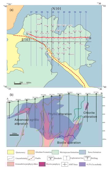 (a) Simplified geology map of the A-B sections in Tiegelongnan []. (b) Anatomy of a condensed porphyry Cu system showing the spatial interrelationships of porphyry Cu orebody, high-sulfidation epithermal Cu ± Au orebody, and late-mineralization andesitic volcanic rocks [].