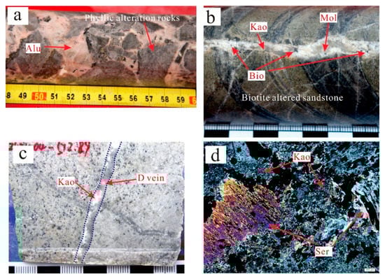 Hydrothermal biotite occurs in wall-rock sandstones beneath an elevation of ~4100 m as disseminated fine grains and less commonly as vein biotite-quartz. It is not typical potassic alteration with no K-feldspar, and rare magnetite, rutile, and anhydrite. Sericite-pyrite-quartz (phyllic) alteration is widespread in the Tiegelongnan deposit, hosting most of the ore minerals. These granodiorite porphyries and their surrounding sandstones are mostly altered to sericite and quartz. Some fluorite, rutile, anhydrite, and magnetite can be identified under the microscope. There are some quartz-chalcopyite-pyrite and quartz-molybdenite veins occurring in the phyllic alteration zone, not intensely. Chlorite alteration is in the southern and eastern part of the deposit, which scattered in the sandstone and diorite and pyrite-chlorite veins. Alunite mostly occurs in the alunite-sulfides veins, locally with kaolinite and dickite, distributed in a narrow and shallow place at a height ranging from 4500 m to 4950 m. Kaolinite-dickite alteration occurs as more widespread kao-dic veins than the alunite veins, which is featured with kaolinite replacing sericite (fine grained muscovite) grains. Except for those minerals, some pyrophyllite occurs in the sericite-pyrite-quartz alteration zone, and the rutile is widespread from the biotite alteration to alunite alteration zones. Biotite, sericite, and chlorite are typical porphyry stage alteration minerals []. It is typical that these porphyry alteration stage minerals are overprinted by epithermal alteration minerals in the Tiegelongnan deposit, and these minerals formed in different occurrences, such as breccia, vein-filling, or as replacement, which corresponds with the multiple dating results on the altered minerals. Biotite and sericite display a 40Ar-39Ar age at ~121 Ma, whereas alunite indicates the age ranging from 117 to 100 Ma []. Alunite-kaolinite-dickite breccia is late epithermal stage products, breaking earlier phyllic altered rocks (Figure 3a). Kaolinite-dickite veins cut the early phyllic and biotite alteration stages’ quartz-sulfide veins. However, they are most commonly shown as kaolinite filling in biotite veins (Figure 3b), and kaolinite fills the barren quartz-pyrite veins in phyllic alteration zone (Figure 3c). Kaolinite also replaces fine muscovite grains in the phyllic alteration zone (Figure 3d). In some cases, a mineral sequence is shown as a single vein, firstly with quartz crystalizing, followed by alunite alteration, and ending up with kaolinite crystalized in the center of the vein. This alunite, kaolinite, and dickite assemblage was documented as acidic minerals and epithermal products in condition of low temperature and low pH value [].