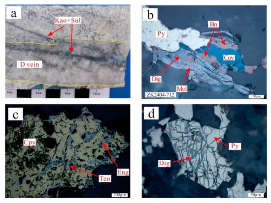 Textures of epithermal sulfides overprinting porphyry sulfides. (a) Kaolinite-sulfide veinlets cross-cut quartz-pyrite veins, (b) later covellite and digenite replacing borinite and pyrite, (c) tennantite and engargite replacing chalcopyrite, (d) pyrite fractures filled with digenite. Bn: bornite; Cpy: chalcopyrite, Cov: covellite, Dig: digenite, Eng: enargite, Mol: molybdenite; Kao: kaolinite, Py: pyrite, Sul: sulfides, Ten: tennantite.