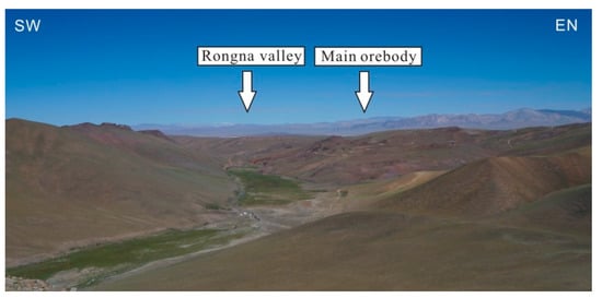 The Tiegelongnan deposit and most of other deposits in the Duolong district are along the NE–SW faults. It is widely accepted that these faults mainly controlled the emplacement of magma and hydrothermal fluids in the Duolong district []. However, there were few convincing studies clarifying the overlying volcanic rocks which conceal the whole porphyry and epithermal ore bodies. The NW–SE faults, named as Rongna Fault, are characterized by geomorphologically linear sunken terrain, valleys, with fault springs seen at the ground level. In the deposits area, the fault occurred as a river valley, which is called the Rongna Valley (Figure 5). The fault divides the Meiriqiecuo Formation andesite into two parts, suggesting the structural movement took place after andesite eruption, which is dated at ~110 Ma [].