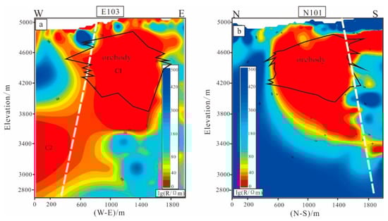 The audio-frequency magneto-telluric method (AMT) was applied to understand the fault features, and further to predict the occurrences of the orebody in a deep level on the south side. From the ATM tests, electrical properties of different rocks obviously vary from each other in the Tiegelongnan deposit. The Cretaceous volcanic cap-rocks have low polarizability, whereas extremely high resistivity is shown in the paleo-weathering crust. The Jurassic sandstone showed low resistivity and high polarization, while the advanced argillic altered sandstone has high resistivity. We found the >0.5% grade Cu whole porphyry and epithermal orebodies correspondent with the low resistivity zone (Figure 6). There are two low-resistivity anomalies (C1 and C2) in the E103 AMT cross-section and the C1 anomaly coincides with the explored orebody. Therefore, the C2 low-resistivity anomaly could be another part of the whole orebody. The fault plane shown in the AMT cross-section is dipping to the south with an angle of 70° to 80° (Figure 6).