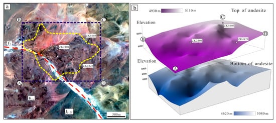(a) High-resolution remote sensing image, and (b) a 3-D map of the Meiriqiecuo Formation andesite []. Red dotted lines: faults; the yellow dotted line: the boundary of the mineralized body.