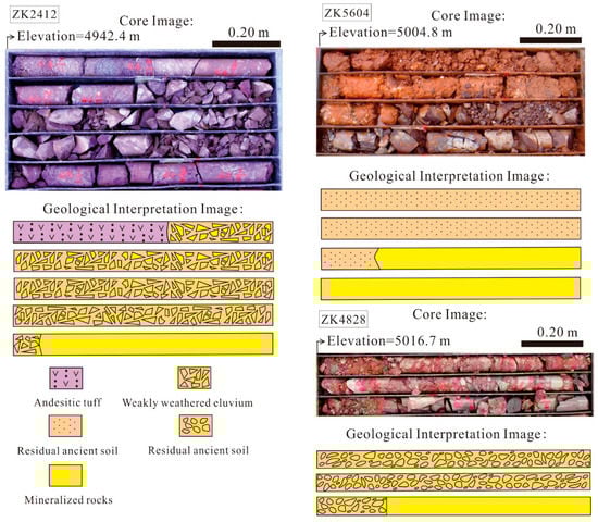 Photographs of typical weathering paleo-crusts in the Tiegelongnan deposit. ZK2412—The first type weathering weakly weathered eluvium. ZK5604—The second type weathering residual ancient soil. ZK4828—The third type weathering slope washes.