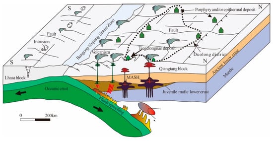 Although there is no specific research on the geochemistry of the porphyry intrusions in the Tiegelongnan deposit, owing to their strong alteration and leaching erasing its geochemical signature, the features of the intrusions in the Duolong district could represent that in the Tiegelongnan deposit. Thus, it suggests that plenty of juvenile crust materials are involved in the intrusions in the Tiegelongnan porphyry Cu (Au) deposit. The juvenile crust materials have been becoming gradually dominated during the Late Mesozoic since the vertical growth and thickening of the continental crust of the southern Qiangtang terrane during the Early Cretaceous [,]. It is commonly accepted that variable sources conjunctly contributed to the formation of magma in this district []. The dominant crust signature from radiogenic isotopes is reported as features of the post-subduction products, which is well explained by Richards (2009) []. All of these suggest that magmatism and mineralization of the Tiegelongnan porphyry Cu (Au) deposit probably occurred in an active continental margin environment after the subduction of BNO plate, as result of continental crust thickening and terranes collision (Figure 9).