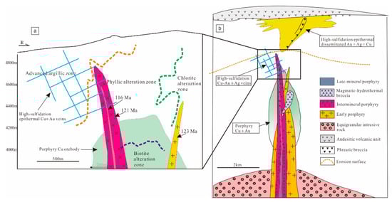 A simplified model (Figure 10) was applied to describe the porphyry Cu system in the Tiegelongnan deposit. Epithermal Cu (Au) mineralization veins are mostly retained in the advanced argillic alteration zone, which overprints phyllic alteration zone on top of porphyry Cu orebody (Figure 10a). This is a transitional zone between the disseminated high-sulfidation epithermal precious metal deposit and the porphyry Cu (Au) orebody (Figure 10b). There might have been disseminated epithermal precious metal deposit existing in theory. The reason of not being detected on the deposit is that it either was not well preserved because of severe erosion or has not been found yet. Deep in the porphyry Cu (Au) system, the bottom of the porphyry Cu orebody has not been detected yet. We suggest there could be economic potential at depth, because biotite alteration is shown at depth, if it could represent the typical potassic alteration, which usually is the core of mineralization orebody in the porphyry Cu system []. Obviously, we did not reveal the whole biotite alteration, which might be concealed at a deeper level.