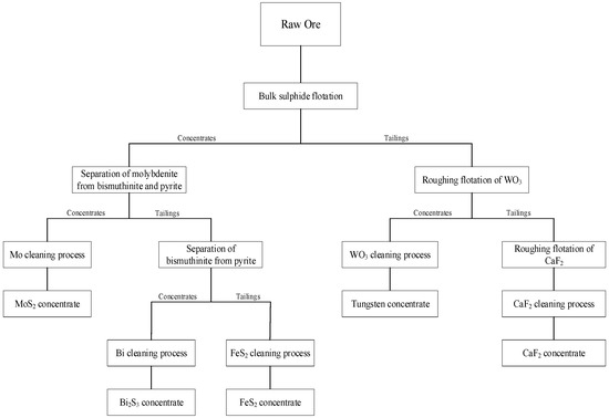 The Shizhuyuan mine is one of the largest polymetallic deposits in the world, having been famous for its W-Sn-Mo-Bi mineralization zone since exploited in the 1960s [1,2]. The Shizhuyuan orefield is located in Hunan province, China, which is 15 km from the southeast of Chenzhou city [3,4], and includes 750,000 t WO3, 490,000 t Sn, 300,000 t Bi, 130,000 t Mo, and 76,000,000 t fluorite [4]. In Dongpo dressing plant, Shizhuyuan ore is first treated with bulk sulfide flotation, followed by tungsten mineral flotation, and fluorite is recovered in the last section. Figure 1 shows the flotation flowsheet of Dongpo dressing plant.