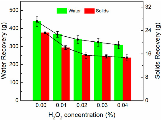 Total solids and water recovery from the concentrate as a function of H2O2 concentration. Error bars represent the standard deviation between duplicate tests.
