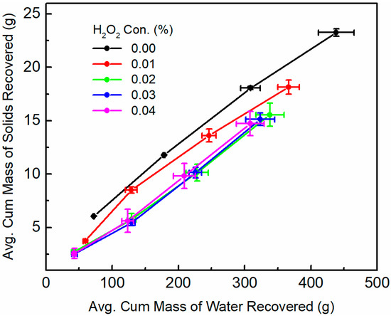 Average cumulative mass of solids versus water at different H2O2 concentrations. Error bars represent the standard deviation between duplicate tests.