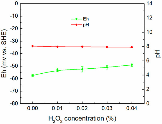 Variations on Eh and pH as a function of H2O2 concentration. Error bars represent the standard deviation between duplicate tests.
