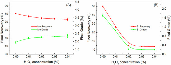 Final recovery and grade as a function of H2O2 concentration: (A) molybdenum, (B) bismuth. Error bars represent the standard deviation between duplicate tests.