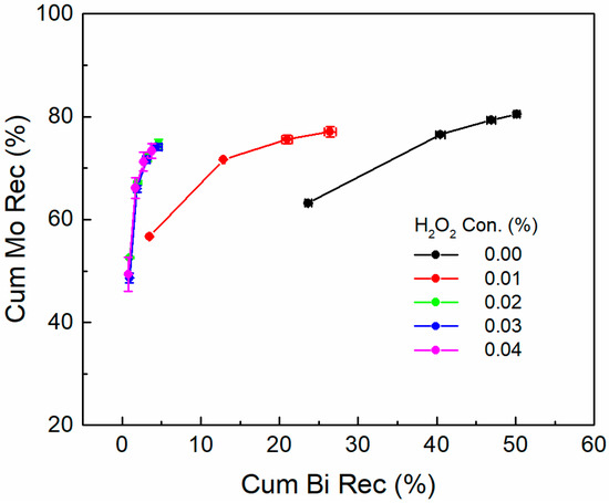 The depressing effect of H2O2 could also be observed from the viewpoints of selectivity between molybdenite and bismuthinite. Figure 6 illustrates the curves of Mo recovery versus Bi recovery with different H2O2 concentrations. The results demonstrated that H2O2 could selectively depress bismuthinite and maintain a higher recovery for molybdenite. The flotation with the addition of H2O2 floated less bismuth minerals than that without adding H2O2. Thus, the H2O2 improved the selectivity between molybdenite and bismuthinite in flotation.