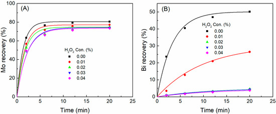 As shown in Figure 7A, the recovery of molybdenum was comparatively high. The addition of H2O2 resulted in a slightly lower Mo recovery than the case without H2O2. However, the molybdenum recovery did not vary much with H2O2 concentration. From Table 2, as H2O2 concentration increased from 0% to 0.04%, the ultimate recovery of molybdenum decreased from 80.51% to 73.36%, following the decrease in rate constant from 0.76 min−1 to 0.46 min−1. With respect to bismuthinite (Figure 7B), both Rmax and k sharply decreased with the increase in H2O2 concentration. The ultimate recovery of bismuth drastically decreased from 50.14% to 4.50%, corresponding to the decrease in rate constant from 0.30 min−1 to 0.08 min−1. The data indicate that H2O2 exerts a negligible influence on the depression of molybdenite but has an obvious depression effect on bismuthinite.