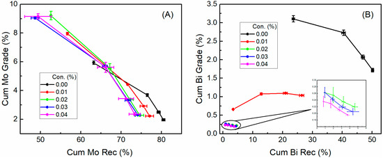 The cumulative grade-recovery curves for molybdenum and bismuth are shown in Figure 8, respectively. As shown in Figure 8A, a molybdenum recovery of 63% was achieved after 2 min of flotation of the Shizhuyuan ore in the absence of H2O2. After adding H2O2, a marginal decline in the recovery of molybdenum occurred, but a considerable rise in grade for the concentrate collected was observed at the first two minutes. However, the final recovery of molybdenum gradually decreased from 80% to 74% in the H2O2 concentration range of 0%–0.04%, and the grade of molybdenum was almost identical under the same H2O2 concentration range. This is an interesting phenomenon, because the k value derived from Equation (1) presents a downward trend when H2O2 is taken into the pulp (Table 2). As mentioned above, the presence of H2O2 results in lower solids and water recoveries from the concentrate (Figure 2 and Figure 3). Therefore, it can easily be deduced that the increase of molybdenum grade at the early stage (first concentrate) is ascribed to the lower recovery of solids.