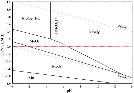 The Eh–pH diagram for the Mo-S-H2O system. Conditions: 1 × 10−4 M molybdenum, 2 × 10−4 M sulfur, 298.15 K, 1 atm.