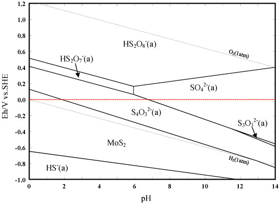 The Eh–pH diagram for the S-Mo-H2O system. Conditions: 2 × 10−4 M sulfur, 1 × 10−4 M molybdenum, 298.15 K, 1 atm.