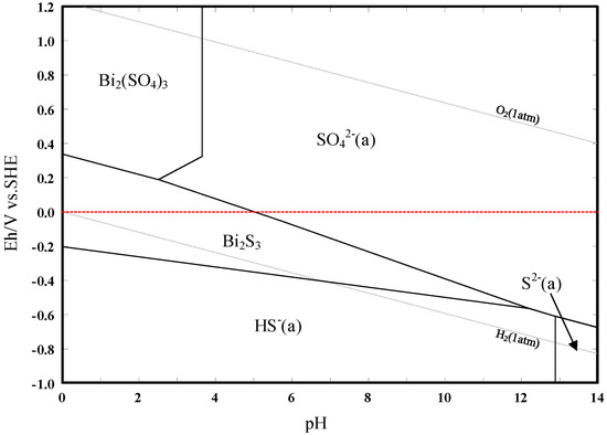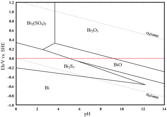 The Eh–pH diagram for the Bi-S-H2O system. Conditions: 2 × 10−4 M bismuth, 3 × 10−4 M sulfur, 298.15 K, 1 atm.