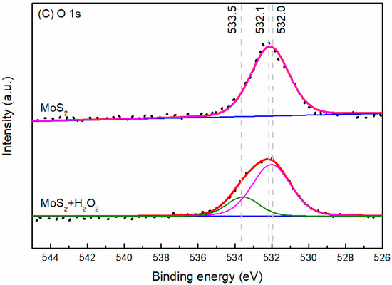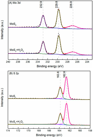 XPS was conducted to analyze the surface chemistry of molybdenite and bismuthinite with and without H2O2 treatment. Figure 13A–C shows the XPS spectra of Mo 3d, S 2p, and O 1s, respectively. The Mo 3d spectra are best fitted with three peaks at 232.9, 229.8, and 226.9 eV. The 3d5/2 peak with binding energy at 229.8 eV has a doublet 3d3/2 peak located at 232.9 eV, which corresponds to the molybdenite species (MoS2) [41,42]. The 2s spectra located at 226.9 eV belongs to MoS2 species [42]. The S 2p spectra depicted in Figure 13B match the binding energy of molybdenite at 162.6 eV and 163.8 eV for 2p3/2 and 2p1/2 [43,44], respectively. The Mo 3d spectra and S 2p spectra do not show any shifting in energy binding and there is no indication of oxide of molybdenum and sulfur species after H2O2 treatment on molybdenite surface. The effect of H2O2 on surface oxidation of molybdenite can be seen from O 1s spectra (Figure 13C). The peak located at 533.5 eV is assigned to the adsorption of oxygen on the molybdenite surface (O2/MoS2) [45]. The peak at 532.1 eV that corresponds to the oxide of the molybdenum species shifted to 532.0 eV after H2O2 treatment, supporting the low surface oxidation of molybdenite [11]. The oxidation products are observed in O 1s spectra rather than Mo 3d spectra, which may be due to the dissolution of molybdenum oxides during H2O2 treatment.