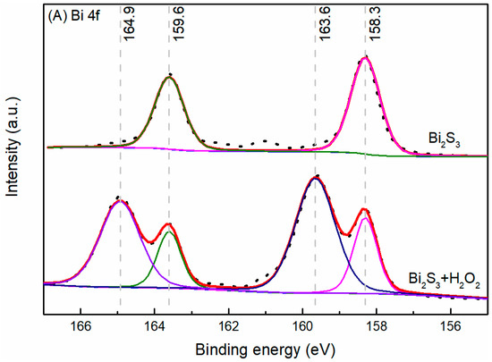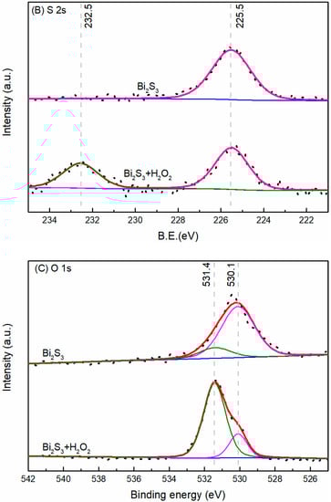 In contrast with the molybdenite surface, there is significant difference in Bi 4f, S 2s, and O 1s of synthetic bismuthinite between untreated and treated surface. Figure 14A shows the XPS spectra of Bi 4f. Before H2O2 treatment, the highest intensity peaks are found at 158.3 and 163.6 eV, corresponding to the spin-orbit doublet of Bi 4f7/2 and Bi 4f5/2, respectively, of bismuth sulfide [46,47,48]. After H2O2 treatment, the presence of shoulders at higher energies of the doublet, 159.6 and 164.9 eV, are associated to the Bi–O bonds [49]. Figure 14B shows the S 2s spectra. The peak at 225.5 eV is in accordance with the Bi–S bond, which is characteristic of S 2s binding energy [50]. The new peak at 232.5 eV after H2O2 treatment is assigned to sulfate [51]. The O 1s spectra presented in Figure 14C are best fitted with two peaks located at 530.1 and 531.4 eV. The former peak corresponds to Bi–O species and the latter is attributed to surface hydroxyls respectively [52]. From the XPS analysis results, it can be easily concluded that H2O2 treatment had a negative effect on the bismuthinite surface due to the formation of oxidation products that precipitate on the bismuthinite surface and alter its surface hydrophobicity.