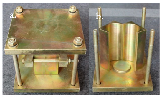 Taking into account the damage of the cemented specimen taken out from the mold, Yilmaz et al. recommend developing a method that could non-destructively produce the specimen [67]. Therefore, we designed a device for creating a cemented rockfill specimen [32], which included two halves of a cylinder, the upper and lower bases, bolts, and lateral fixing component, as shown in Figure 1. According to the standards of the American Society for Testing and Materials (ASTM) and the International Society for Rock Mechanics and Rock Engineering (ISRM), we used this device to produce the cemented rockfill specimen, which was a cylindrical specimen of ϕ50 × 100 mm [68,69,70]. The lateral fixing component was used to clamp the two halves of the cylinder in the production of the cemented rockfill specimen, as shown in Figure 1a. When the specimen needed to be removed from the mold, the clamped cylinder was split into two halves, as shown in Figure 1b.