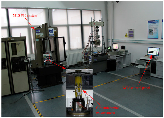 The MTS815 rock mechanics test system was used to carry out the uniaxial and triaxial compression tests, as shown in Figure 2. The initial pre-stress on the cemented rockfill specimen was 0.25 KN and the axial loading rate was 0.002 mm/s in both the uniaxial compression and triaxial compression tests [79]. It should be noted that the confining pressure must be loaded to the specific values of 0.5, 1, and 2 MPa at a rate of 0.04 MPa/s in the triaxial compression [80].