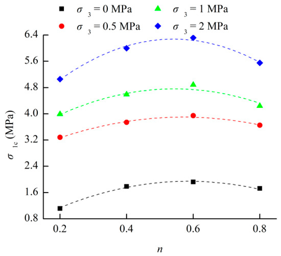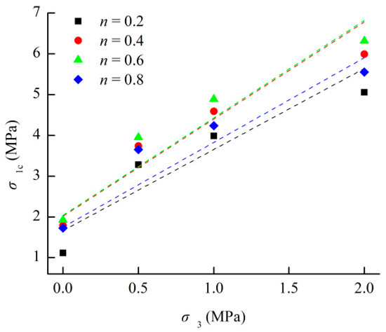 Figure 3 shows the relationship between the compressive strength of the cemented rockfill specimen and confining pressure under different granule gradations; the corresponding relationship is listed in Table 4. Then, the strength parameters of cohesive force, internal friction angle, and tensile strength can be obtained, being based on the Mohr-Coulomb strength criterion [81]:
