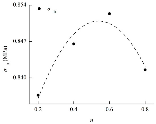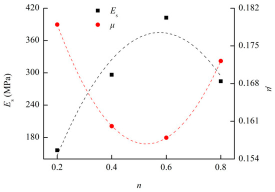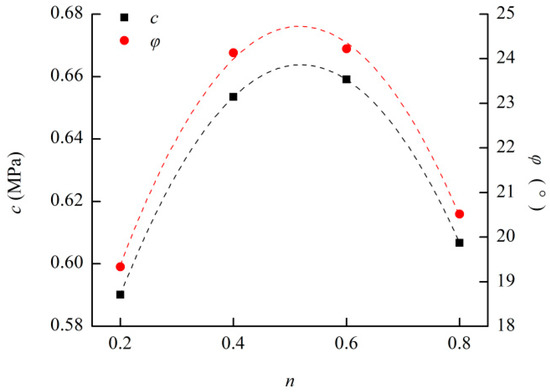 Figure 4, Figure 5, Figure 6 and Figure 7 give the relationships between the mechanical parameters (Poisson ratio, elastic modulus, compressive strength, cohesive force, internal friction angle, and tensile strength) of the cemented rockfill and the Talbot index of granule gradation and the corresponding relationships are presented in Table 5. It can be seen from the Figure 4, Figure 5, Figure 6 and Figure 7 that the Poisson ratio first decreased, and then increased with the increase of the Talbot index, however, other mechanical parameters first increased and then decreased with the increase of the Talbot index. This indicates that there is an optimal particle size distribution that can maximize the mechanical parameters of cemented rockfill, for which the optimal granule gradation is in the range of 0.4–0.6 based on the Talbot gradation. Therefore, the relations between the mechanical parameters of cemented rockfill and the Talbot index of granule gradation can be described by quadratic polynomial functions, and the extreme of the established function can be used to characterize the optimal granule gradation of the cemented filling material.