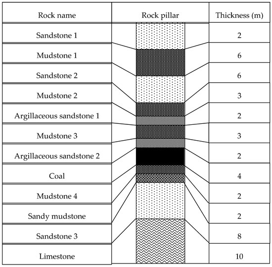 In a coal mine located in Anhui, China, the reserves of coal buried under railways, aquifers, and buildings reach 2.080 × 107 t, the average thickness of the coal seam is 4 m at a buried depth of 525 m. Figure 8 presents the distribution and average thicknesses of each stratum above and below the coal seam in one coalface. The ground affecting area corresponding to the coal mining area contains the railways, highways, affiliated buildings, and some factories. In order to minimize the damage to the overlying strata and protect the surface structure [82], this coal mine applied the fully-mechanized longwall mining and filling [83]. Figure 9 shows the schematic diagram of the coalface in filling mining, where the span of this coalface was 100 m, and a shearer was used to mine the coal seam, and advanced in the Y direction [84]. One of the roadways at both ends of the coalface was used to transport the coal out from underground, apply the belt transportation, and the other roadway was used to transport the filling material from the ground to the filling area. The six-pillar hydraulic support was placed behind the coalface to support the coal seam roof, which could facilitate filling in the goaf. A plant for storing the cement material, a plant for storing the fly ash, and a plant for storing water were built on the ground and then connected to a mixing tank. The waste rock formed after ore treatment and gangue with low coal were stacked in a fixed area to produce the filling material. It should be noted that in this coal mine, the waste rock accounted for a lower proportion of the mined ore, so the solid waste that was produced by the surface factories in the mine area was applied, and an additional open quarry was built nearby to supplement a small amount of filling material. The crusher was arranged near the gangue mountain to facilitate the crushing of the waste rock and produce particles into the designed size. The crushed waste rock, cement material, fly ash, and water were mechanically transferred to the mixing tank according to the designed scheme to form a high-concentration slurry, which was transported underground through the pipeline under the condition of using the filling material’s own gravity and the filling pump to fill the goaf [85].