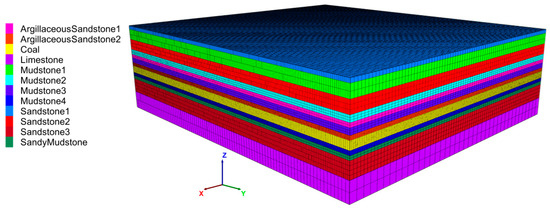 Based on the above engineering background, a numerical model of a coalface in the coal mine was established to simulate the processes of excavation and filling in FLAC3D, where the model size of (X, Y, Z) was (160 m, 180 m, 50 m). The coalface was along the X direction with a span of 100 m, leaving 30 m left and right. The mining direction was along the Y direction with a total mining distance of 120 m, leaving 30 m at the front and rear. The meshes of coal seam and its roof and floor strata were refined, the Coal, Argillaceous sandstone 2, and Mudstone 4 were divided into one unit every 1 × 0.5 × 0.5 m3, and the entire model was divided into 986,400 units and 1,085,879 nodes, as shown in Figure 10. A uniform load of 12.5 MPa was applied to the top surface of the model to simulate a buried depth of 525 m, and a horizontal constraint was imposed on the surrounding boundaries and a vertical constraint imposed on the bottom boundary. The contact difficulty between the cemented filling material and the coal seam roof was not considered in the establishment of this model; it was assumed that the filling material could completely fill the goaf. The initial coalface was located at X from 30 m to 130 m, Y of 30 m, Z from 22 m to 26 m, and advanced in the Y direction. According to the actual working condition, in the first step, the coal seam was excavated from m to m, and the goaf in was immediately filled with the cemented rockfill, then the model was balanced. In the second step, the coal seam was excavated from m to m, and the goaf in was immediately filled with the cemented rockfill, then the model was also balanced. When it was mined to 120 m in this way, the model was balanced and stopped. Here, according to the advancement distance of the coalface in the actual effective mining stage in the engineering, the mining distance of each step was designed as 20 m. The Mohr-Coulomb model was used for both the rock mass and the backfill, and the specific model parameters are shown in Table 6 and Table 7.