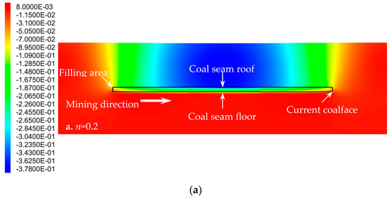 Figure 20 gives the Z-direction displacement field of the strata (Y-Z profile at X of 80 m) at mining distances of 40 m to 80 m under fallen mining and filling mining with n = 0.6 cemented rockfill. It can be seen from the Figure 20 that the displacement fields under both of the mining methods were not too different when the excavation was small, that is, 40 m, as shown in Figure 21a,c. The subsidence displacements of the coal seam roof were maintained at the same magnitude, so the hard roof will not fracture, causing a larger subsidence displacement under this condition. However, with the advancement of the coalface, the overlying strata upper coal seam were continuously bent and deformed under the tensile shear stress. A large number of fissures were generated inside the rock mass, and the transfixions of the fissures caused fractures in the coal seam roof and the overlying key rock formation, so the overlying strata completely collapsed, as represented in Figure 21b. However, the maximum subsidence displacement while using filling mining with n = 0.6 cemented rockfill was only 0.15 m, which protected the integrity of the overlying strata. Therefore, it is beneficial to control the strata movement and protect the structure of the underground key rock formation. This paper mainly discussed the influence of the particle size distribution of the aggregate in the cemented rockfill on the stability of the strata in the filling mining instant. The influence of the difference between the cemented filling materials on the displacement and stress fields of the strata was analyzed based on the actual cemented rockfill in the test. The results showed that optimizing the particle size distribution of the aggregate in cemented rockfill could increase the loading capacity of the backfill to improve the filling effect, effectively control the strata movement, and decrease the stress of the rock mass in the coalface to reduce the potential danger. It can be promoted in engineering to benefit the economics, safety, and stability. However, the backfill is in a creep state under three-direction compression during its service. Although it shows a perfect engineering behavior in the mining instant, it is not enough to prove that it can perfectly protect the overlying strata above the coal seam during the whole service process. For this purpose, it is necessary to study the mechanical behavior of the cemented rockfill with different particle size distributions under creep in order to reproduce the displacement and stress fields of the strata in filling mining with the cemented rockfill during the creep process, and to investigate whether the optimization on the particle size distribution of the aggregate in the cemented rockfill under the creep condition can still protect the stability of the underground structure and the integrity of the overlying strata, which will be the subject of the authors’ future work.
