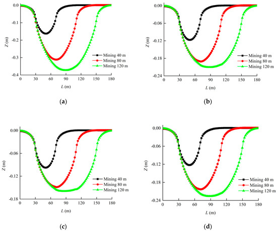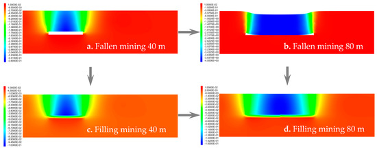 The Z-direction displacement field of the strata (Y-Z profile at X of 80 m) at mining distances of 40 m to 80 m under fallen mining and filling mining with n = 0.6 cemented rockfill. Fallen mining at 40 m (a); Fallen mining at 80 m (b); Filling mining at 40 m (c); and, Filling mining at 80 m (d).
