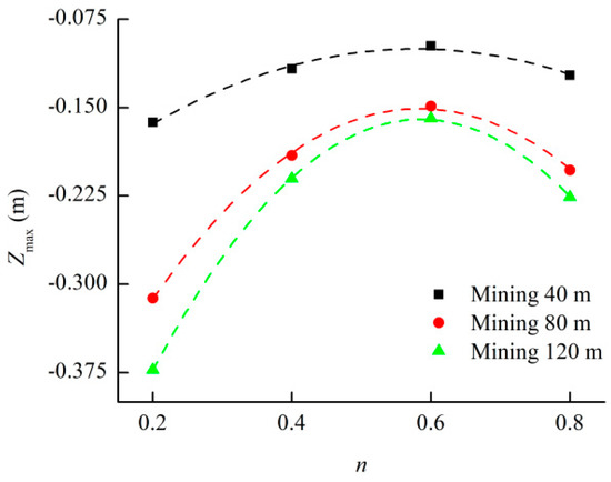 Figure 11 gives the Z-direction displacement field of the strata (Y–Z profile at X of 80 m), when the goaf was filled with cemented rockfill with different granule gradations at a mining distance of 120 m. It can be seen from the Figure 11 that the movement of each stratum was mainly located above the filling area. The closer to the filling area, the greater the subsidence displacement of the stratum, and is concentrated in the middle of each stratum. As both ends of the filling area can still rely on the original rock mass to load, it presents a small subsidence displacement. The cemented rockfill with different granule gradations has a great effect on the movement of each stratum in filling mining, where the subsidence displacement of the overlying strata is the largest when the goaf is filled with cemented rockfill with a Talbot index of 0.2, while that of the other Talbot indices of granule gradations are relatively small. In order to quantify the influence of the particle size distribution of the aggregate in the cemented rockfill on the subsidence displacement of the overlying strata, Figure 12 presents the subsidence displacement of the coal seam roof at different mining distances when the goaf was filled with cemented rockfill with different granule gradations. Figure 13 shows the relationship between the maximum subsidence displacement of the coal seam roof and the Talbot index of cemented rockfill at different mining distances, and Figure 14 presents the coupling effect of the cemented rockfill’s granule gradation and mining distance on the maximum subsidence displacement of the coal seam roof. It can be seen from the Figure 12, Figure 13 and Figure 14 that the subsidence displacement of the coal seam roof increased with the advancement of the coalface, but the fall velocity gradually slowed down. The maximum subsidence displacement always occurred above the middle of the filling area, and it had a quadratic polynomial relation with the Talbot index of the cemented rockfill; the corresponding relationship is listed in Table 8. When filling mining at 40 m with the cemented rockfill applied with different granule gradations, the difference among the maximum subsidence displacements of the coal seam roof was not large, and the displacements were maintained at about 0.10–0.15 m. However, with the advancement of the coalface, the cemented rockfill with different granule gradations had a great effect on the maximum subsidence displacements of the coal seam roof. When filling mining at 120 m, the maximum subsidence displacement when using the cemented rockfill with a Talbot index of 0.6 was only 0.1593 m, which was not too different from that of 0.1172 m when filling mining at 40 m. It was considered that the subsidence displacement gradually becomes stable with the advancement of the coalface, and the cemented rockfill with a Talbot index of 0.6 was superior and it could effectively control the movement of the overlying strata. Conversely, when the goaf was filled with cemented rockfill with a Talbot index of 0.2 at the mining distance of 120 m, the maximum subsidence displacement of the coal seam roof reached 0.3728 m, and there was still a tendency to continue to fall. The filling effect while using this cemented rockfill with a Talbot index of 0.2 was obviously poor, which was also fully reflected in the spatial relation of Figure 13. Thus, it was considered that optimizing the particle size distribution of the aggregate in the cemented rockfill could effectively control the strata movement.