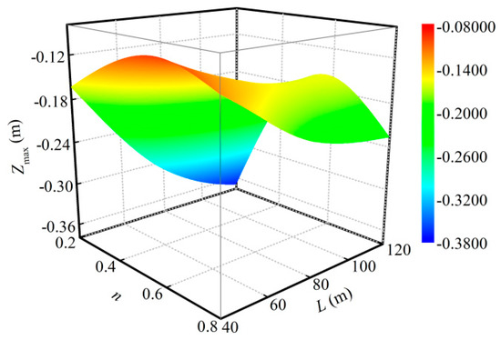 The Z-direction displacement field of the strata (Y–Z profile at X of 80 m) when the goaf was filled with cemented rockfill with different granule gradations at a mining distance of 120 m. n = 0.2 (a); n = 0.4 (b); n = 0.6 (c); and, n = 0.8 (d).