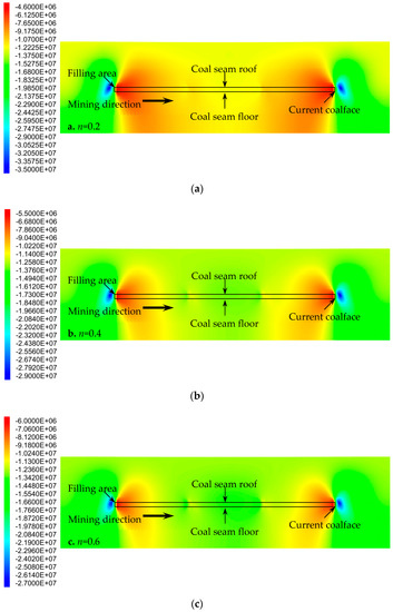 - The stress of the strata was concentrated in the rock mass in the coalface. The stress field distribution in the filling area presented a large stress in the middle part and small stress at the two ends. This distribution characteristic was also suitable for describing that of each stratum above and below the filling area. The internal stress of the backfill and the stress of the rock mass in the coalface increased with the advancement of the coalface, but the increasing rates gradually slowed down. The maximum internal stress of the backfill was always located in the middle of the filling area, where the maximum value was in a quadratic polynomial relation with the Talbot index of the cemented rockfill. This function is also suitable for describing the relationship between the stress of the rock mass in the coalface and the Talbot index of the cemented rockfill. It was considered that optimizing the particle size distribution of the aggregate in the cemented rockfill could improve the loading capacity of the backfill in order to improve the filling effect, and it could decrease the internal stress of the rock mass in the coalface to reduce the potential dangers around the coalface.