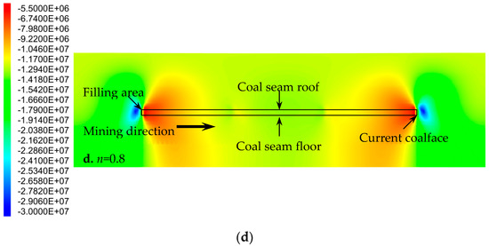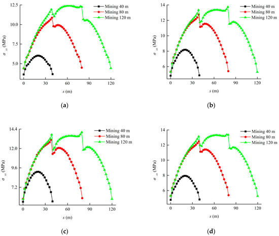 Internal stress of the backfill at different mining distances when the goaf was filled by cemented rockfill with different granule gradations. n = 0.2 (a); n = 0.4 (b); n = 0.6 (c); and, n = 0.8 (d).