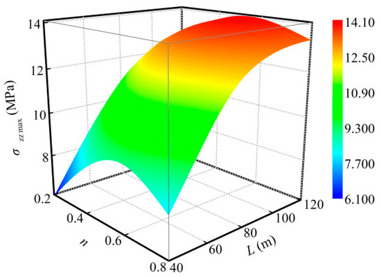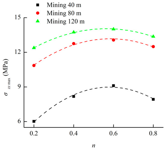 Figure 15 gives the Z-direction stress field of the strata (Y-Z profile at X of 80 m) when the goaf was filled with cemented rockfill with different granule gradations at a mining distance of 120 m. It was not difficult to see from the Figure 15 that the stress was concentrated in the rock mass in the coalface. The stress field distribution in the filling area presented large stress in the middle part and small stress in the two ends. This distribution characteristic is also suitable for describing that of each stratum above and below the filling area. The excavation and unloading of the coal mass caused the rock mass at both ends of the filling area to load most of the stress. Then, while using the cemented rockfill material to fill the part of the excavation, the subsidence deformations of the coal seam roof and its overlying strata were diffused from the middle to both ends, and the displacement and stress in the middle of the backfill gradually decreased towards both ends. The cemented rockfill with different granule gradations had a great effect on the stress fields of the rock mass and backfill. The stress of the rock mass in the coalface was the highest when the goaf was filled with the cemented rockfill with a Talbot index of 0.2, while the internal stress of the backfill was the smallest. This was the opposite of the cemented rockfill with other granule gradations. In order to quantify the influence of the particle size distribution of the aggregate in the cemented rockfill on the stress field of the strata, Figure 16 provides the internal stress of the backfill at different mining distances when the goaf was filled by cemented rockfill with different granule gradations; Figure 17 presents the relationship between the maximum internal stress of the backfill and the Talbot index of the cemented rockfill at different mining distances; Figure 18 plots the coupling effect of the cemented rockfill’s granule gradation and the mining distance on the maximum internal stress of backfill; Figure 19 shows the relationship between the maximum stress of the rock mass in the coalface and the Talbot index of the cemented rockfill at different mining distances; and, Figure 20 depicts the coupling effect of the cemented rockfill’s granule gradation and the mining distance on the maximum stress of the rock mass in the coalface. It is easy to see from the Figure 16, Figure 17, Figure 18, Figure 19 and Figure 20 that the internal stress of the backfill and the stress of the rock mass in the coalface increased with the advancement of the coalface, but the increasing rates gradually slowed down. The maximum internal stress of the backfill was always located in the middle of the filling area, where the maximum value was in a quadratic polynomial relation with the Talbot index of the cemented rockfill, the corresponding relationship is listed in Table 9. This function is also suitable for describing the relationship between the stress of the rock mass in the coalface and the Talbot index of the cemented rockfill, as shown in Table 10. When the goaf was filled by the cemented rockfill with different granule gradations, the internal stress of the backfill and the stress of the rock mass in the coalface presented huge differences, where the differences among the internal stresses of backfills could reach 3 MPa, and the difference among the stresses of the rock mass in the coalface could reach 9 MPa. Here, the filling effect of the cemented rockfill with a Talbot index of 0.6 was obviously better than those with other granule gradations. It was considered that optimizing the particle size distribution of the aggregate in the cemented rockfill could improve the loading capacity of the backfill to improve the filling effect, and it could decrease the internal stress of the rock mass in the coalface to reduce the potential dangers around the coalface, such as rock burst.