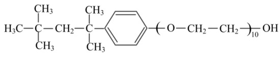 Triton X-100, formally named as t-octyl phenoxy polyethoxy ethanol, is a water-soluble nonionic surfactant with an aromatic hydrocarbon and branched alkyl substituent as a hydrophobic group and a polyethylene oxide chain as a hydrophilic group. Chemical structure of Triton X-100 is shown in Figure 1. It is widely used as a solubilizer, detergent, or dispersing or wetting agent due to its chemical stability, good wettability, and low toxicity [20,21]. Interestingly, our previous research showed that Triton X-100 could accelerate the bioleaching rate of chalcopyrite, though it has a detrimental impact on ferrous-oxidizing activity of bioleaching microorganisms [22]. However, little information has been done on its effect on the oxidation process, and on the formation of surface passivation films. It is clear that understanding its mechanism could offer a new alternative for the enhancement of copper recovery via bacterial leaching.